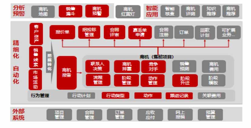 支撐從線索、商機、報價、投標、合同、回款管理整個LTC銷售過程的業(yè)務閉環(huán);支持業(yè)務流程自動化配置;支持與ERP等系統(tǒng)進行對接