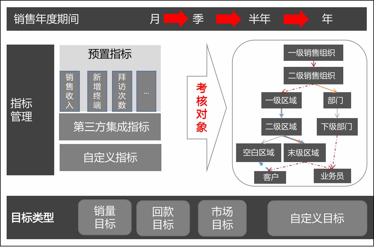 支持企業(yè)各級區(qū)域、人員、客戶的營銷目標管理;支持營銷指標的擴展定義;支持目標下達上報的業(yè)務流程;基于目標及外部數(shù)據(jù)提供相關的決策分析(業(yè)績、過程及行為、客戶、活動等)