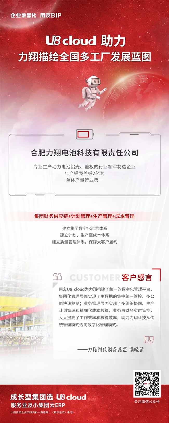 力翔科技是新能源電池外殼領(lǐng)域快速發(fā)展的企業(yè),通過用友 U8 cloud完成數(shù)智化轉(zhuǎn)型,實(shí)現(xiàn)集團(tuán)主數(shù)據(jù)統(tǒng)一管理、規(guī)范七大管理流程、滿足 IPO審計要求,實(shí)現(xiàn)全國多工廠快速復(fù)制擴(kuò)張。