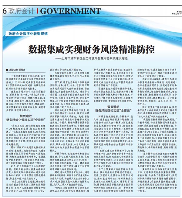 浦東生態(tài)局財務中心主任喬敏介紹,系統貫徹“數字化、一體化、共享化、智能化”的設計理念,構建網絡互聯、業(yè)務覆蓋、數據集中、信息共享的財務管理體系,利用數據穿透技術,精準識別、及時預警并有效處理財務風險,實現源頭管控,強化風險防控。