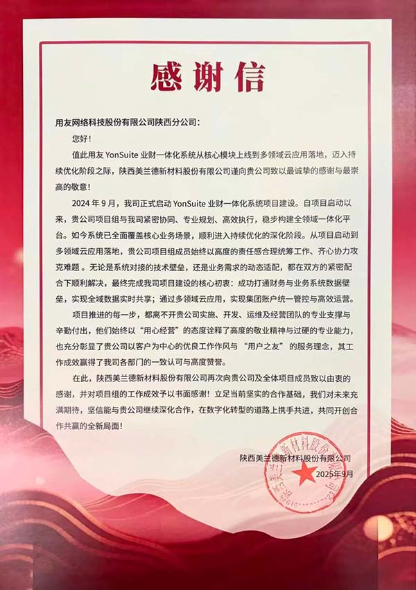 在陜西這片千年秦韻與現(xiàn)代科創(chuàng)交相輝映的熱土上,制造業(yè)的數(shù)智化轉(zhuǎn)型浪潮奔涌向前。陜西美蘭德新材料股份有限公司,作為國內(nèi)炭/炭復(fù)合材料領(lǐng)域的領(lǐng)軍企業(yè),在與用友網(wǎng)絡(luò)科技股份有限公司陜西分公司的長期合作中,始終以深度信任為基礎(chǔ),堅持“整體規(guī)劃、分步實施”策略,穩(wěn)步推進(jìn)數(shù)智化轉(zhuǎn)型。雙方以用友YonSuite全鏈路云服務(wù)為支撐,攜手打造一體化數(shù)智平臺,實現(xiàn)了業(yè)財深度融合與高效協(xié)同管理,為陜西制造業(yè)的轉(zhuǎn)型升級提供了可借鑒的實踐路徑。