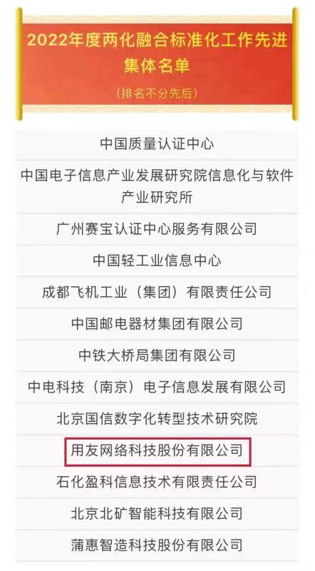 據(jù)悉,為切實貫徹中共中央、國務(wù)院《國家標(biāo)準(zhǔn)化發(fā)展綱要》,全面落實《“十四五”信息化和工業(yè)化深度融合發(fā)展規(guī)劃》的工作部署,充分調(diào)動社會各界協(xié)同推進(jìn)兩化融合標(biāo)準(zhǔn)化工作的積極性和創(chuàng)造性,推動兩化融合標(biāo)準(zhǔn)高質(zhì)量發(fā)展,全國兩化融合標(biāo)委會(TC573)經(jīng)自主申報、材料審查和綜合評審,授予用友網(wǎng)絡(luò)科技股份有限公司等13家單位為“2022年度兩化融合標(biāo)準(zhǔn)化工作先進(jìn)集體”,表彰先進(jìn),引領(lǐng)發(fā)展。