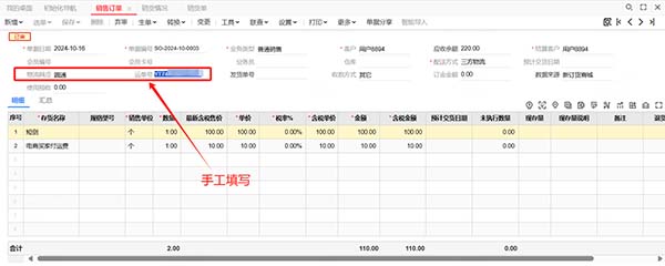 此時(shí)銷售訂單的物流網(wǎng)點(diǎn)和運(yùn)單號(hào)字段都是空的,選擇網(wǎng)點(diǎn),填寫物流單號(hào)